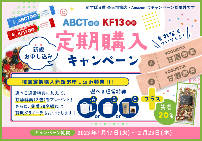 2023年1月17日(火)~2月23日(木)までの期間、定期購入新規お申し込みキャンペーンを開催します。ABCT種菌ま…