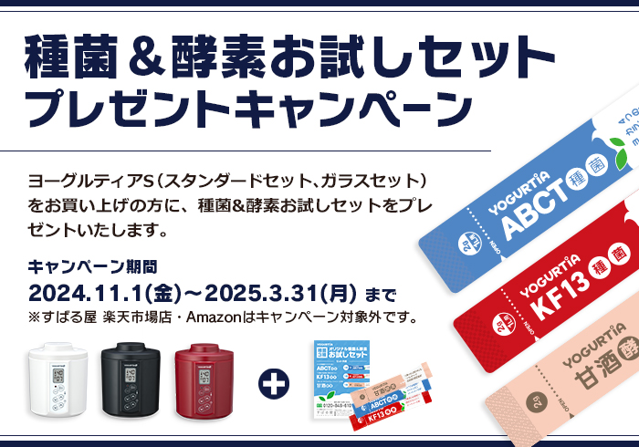 2024.11.01 キャンペーン 種菌&酵素お試しセットプレゼントキャンペーン開催! 2024年11月1日(金)~2025年3月31日(月)までの期間、種菌&酵素お試しセットプレゼントキャンペーンを開催し…