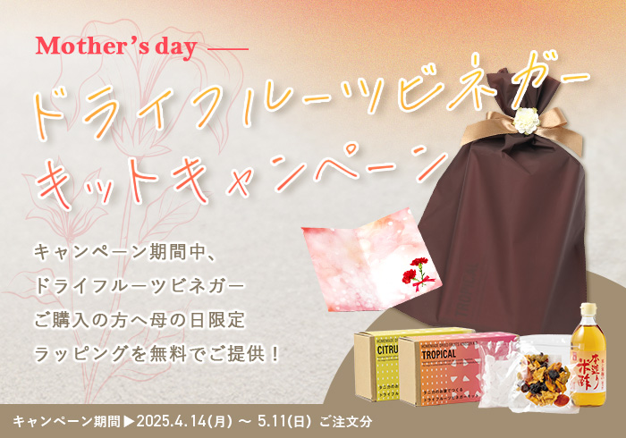 2025.04.14 キャンペーン 2025年ドライフルーツビネガーキットキャンペーン開催! 2025年4月14日(月)~5月11日(日)までの期間、ドライフルーツビネガーキットキャンペーンを開催します。期間中に…