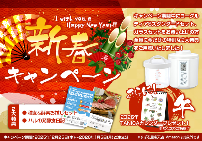 キャンペーン期間中にヨーグルティアSスタンダードセット、ガラスセットをお買い上げの方に特典をご用意いたしました。米こうじなしで甘酒が作れる甘酒酵素(2包)、「効く!生甘酒」の本、発酵食作りに便利なタニカオリジナルシール2種類をプレゼント!母の日オリジナルラッピングも無料でご用意しております。
