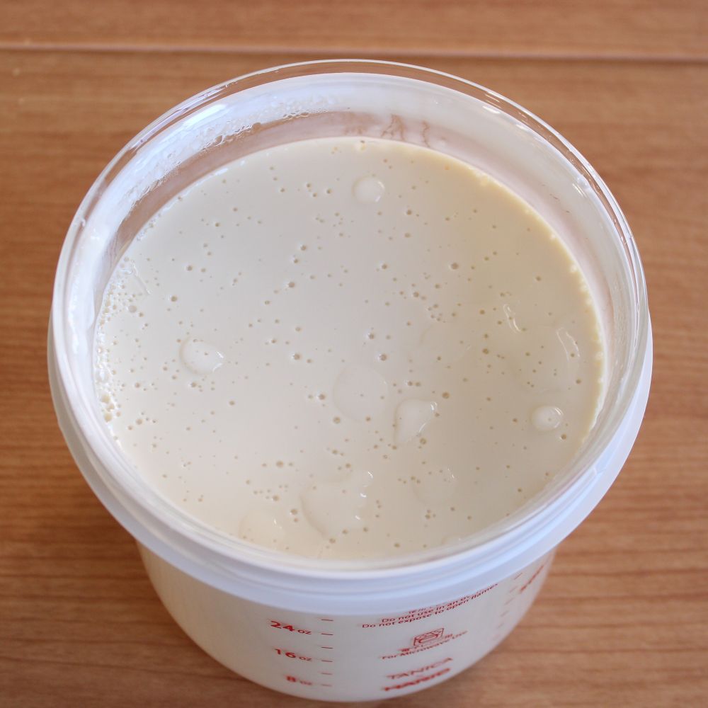消毒したガラス内容器(内容器)に豆乳を200mlほど入れ、ヨーグルトを加えて混ぜます。